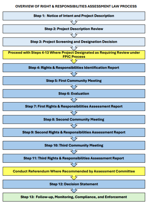 Step 11 – Third Rights & Responsibilities Assessment Report (60 days): The Assessment Committee will update the Second Rights & Responsibilities Assessment Report and prepare the Third Rights & Responsibilities Assessment Report which: summarizes community perspectives on the overall acceptability of the Designated Project; and makes a final FPIC Recommendation or issues a recommendation that a community referendum be held.